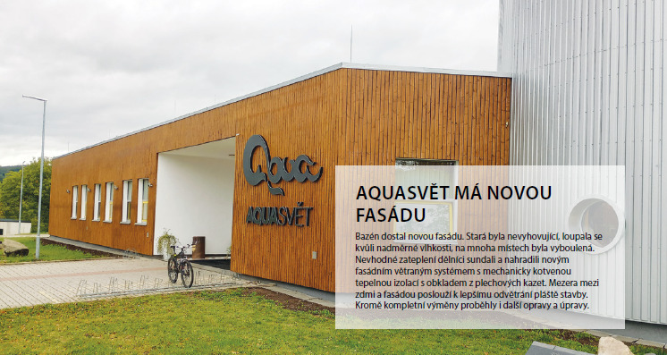 Stavba řešila opravu fasády. Nevyhovující provedení kontaktního zateplovacího systému na vybraných částech bazénového komplexu bylo odstraněno a nahrazeno novým fasádním větraným systémem s mechanicky kotvenou tepelnou izolací s obkladem z plechových kazet. Vzhledem k omezenému rozsahu stavebních úprav lze konstatovat, že stavební úpravy neměly negativní vliv na mechanickou odolnost a stabilitu konstrukcí. Stavba řešila kompletní výměnu skladby vnějšího kontaktního zateplovacího systému na vybraných částech fasády za větraný fasádní systém a další související opravy.