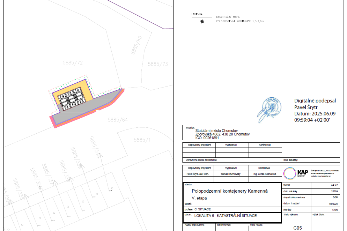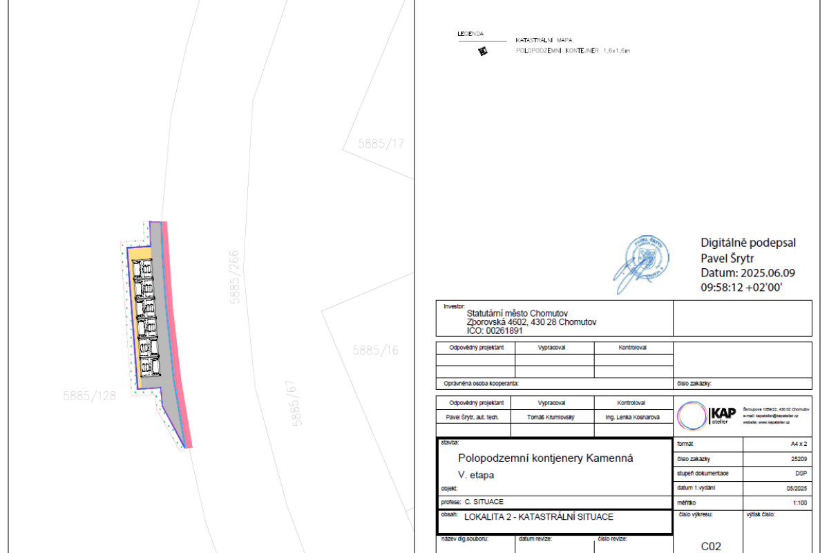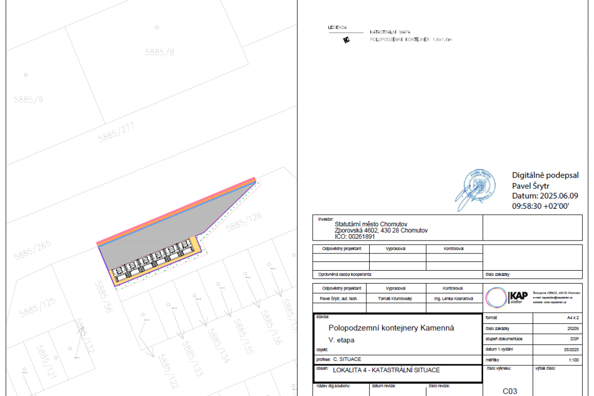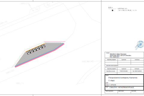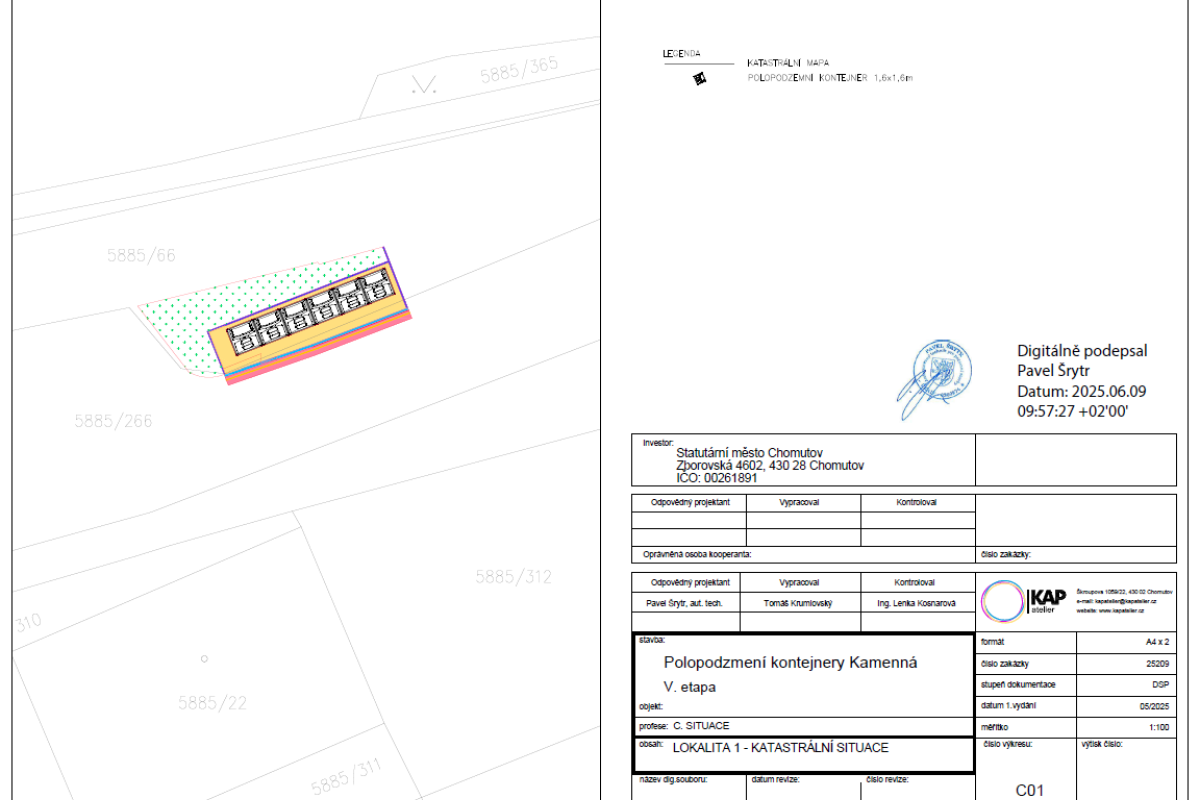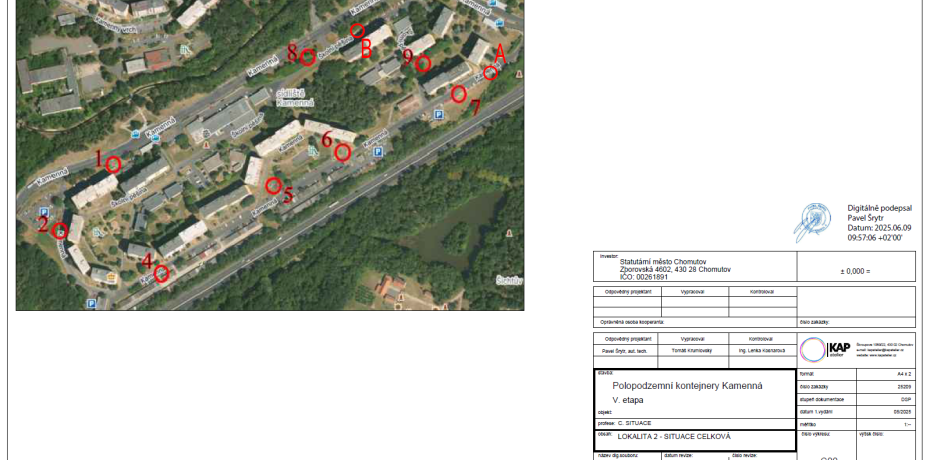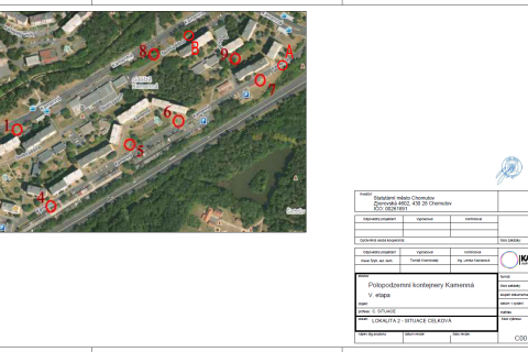 Předmětem plnění bylo vybudování 8 velkokapacitních "hnízd" (stání) polopodzemních kontejnerů na směsný a tříděný komunální odpad a 2 parkovacích ploch v lokalitě sídliště Kamenná v Chomutově: