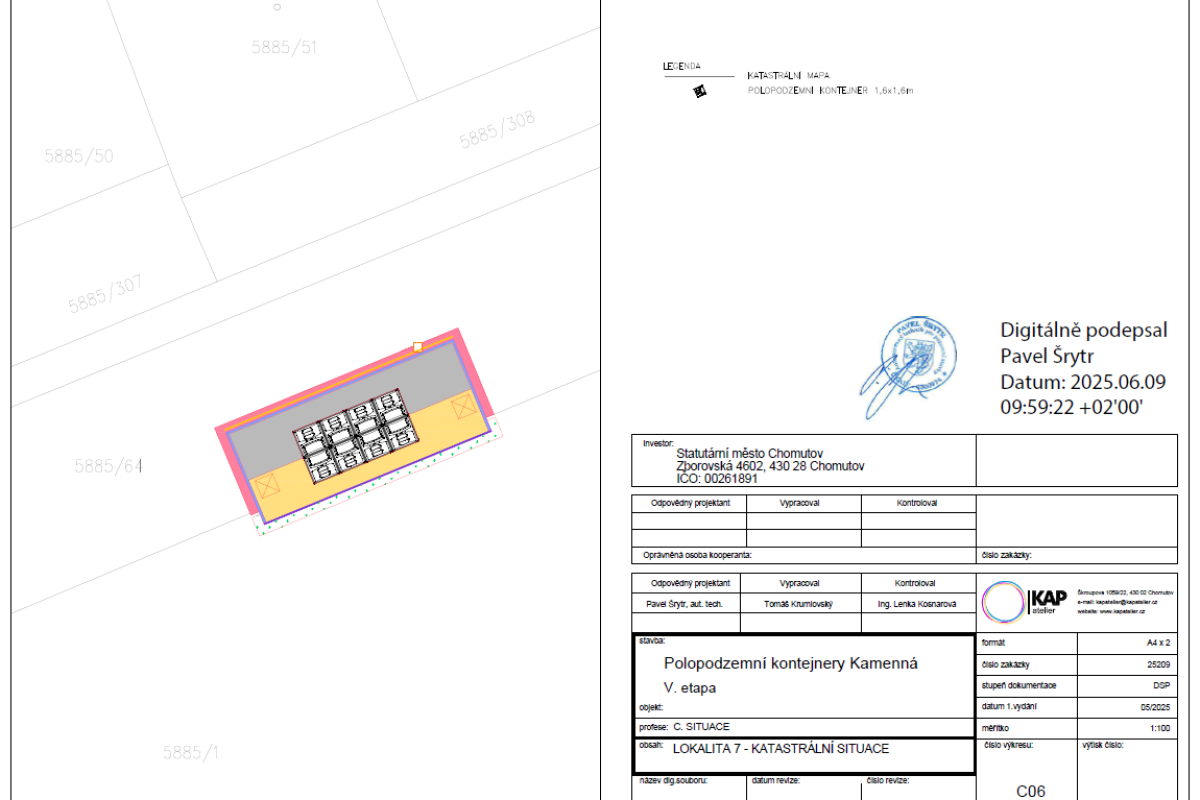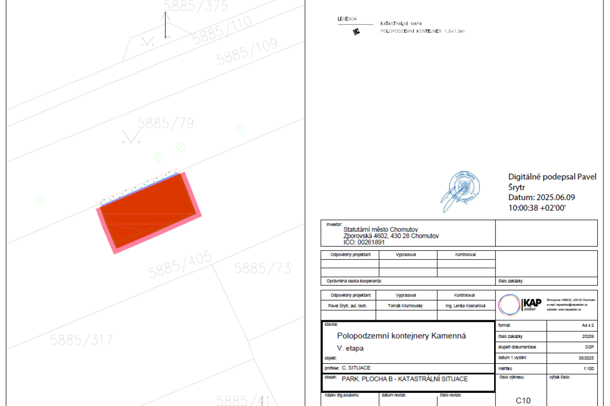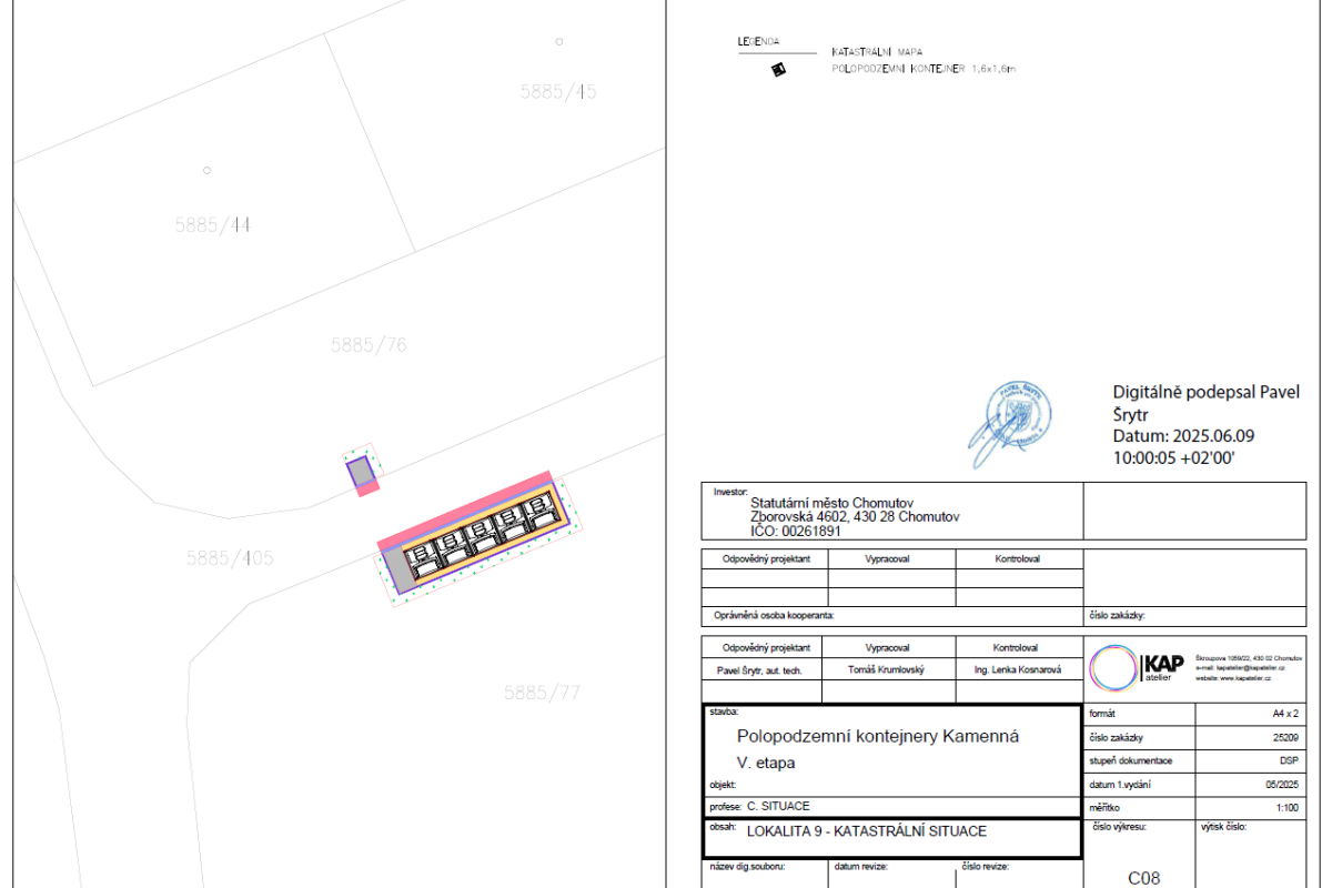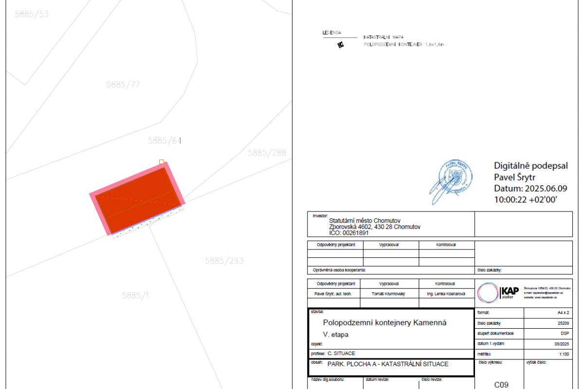 Předmětem plnění bylo vybudování 8 velkokapacitních "hnízd" (stání) polopodzemních kontejnerů na směsný a tříděný komunální odpad a 2 parkovacích ploch v lokalitě sídliště Kamenná v Chomutově:
