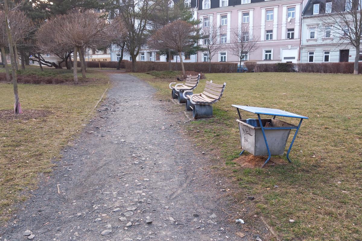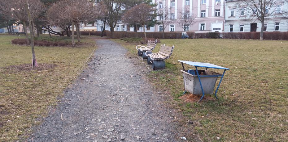 Park s velkým potenciálem si zaslouží novější ráz a důstojnější zacházení. Přidat do parku čtyři nové lavičky s opěrkami uprostřed, kvůli případnému polehávání bezdomovců/nepřizpůsobivých apod., ideálně interaktivně rozmístit (naproti sobě). Vedle laviček nainstalovat nové litinové koše.